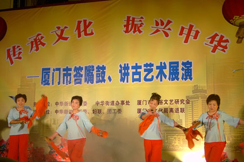 3月15日晚,中华街道与厦门市通俗文艺研究会在中山路步行街小走马路露天舞台举办了一场以“传承文化,振兴中华”为主题的答嘴鼓、讲古艺术展演。此次展演在于传承文明,倡导人文关怀,保护非物质文化遗产,弘扬闽南传统文化,建设中华新城区。演出由快板表演《百年老街第二春》拉开了序幕,节目丰富丰富多彩,幽默、风趣、诙谐的答嘴鼓《活广告》、《地名学》反映了文明城市、和谐社会、社科知识的主题,厦门讲古仙范寿春主讲的《林巧稚半夜出诊》博得了市民的阵阵掌声;而厦门卫视节目主持人阿福主讲的方言故事《相痣》更是让市民捧腹大笑。答嘴鼓《妇女权益保障法就是OK》、《近亲莫嫁娶》、小品《迟到的生日礼物》、锦歌说唱《优育才会出好苗》体现了妇女维权、防止家庭暴力、计划生育、尊老敬老爱老美德等具有鲜明时代特征的深刻内涵,男高音歌唱家李战和的一首《母亲》令市民欢呼声不绝于耳,纷纷要求再来一首。此次精彩的表演吸引了上千名过往群众驻足观看,同时也让来自各地的群众进一步了解闽南文化,提升城市文化品位,教育群众、启发群众。(中华街道妇联)