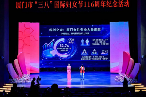 3月6日,“巾帼建功‘十五五’ 鹭岛芳华谱新篇”厦门市“三八”国际妇女节116周年纪念活动举行。市委书记崔永辉向全市广大妇女同胞致以节日的祝贺,向在各行各业勤勉奉献的妇女工作者致以诚挚的问候,向所有关心支持妇女事业发展的社会各界人士表示衷心的感谢。市委副书记李辉跃出席会议,并为全国级优秀女性和集体代表颁奖。 中国式现代化新征程上,每一位妇女都是主角。会议指出,过去一年,全市广大妇女同胞牢记嘱托、奋勇争先,在经济建设主战场、科技创新最前沿、社会治理第一线、家庭文明主阵地,用柔肩担起重担、以实干诠释担当,撑起了厦门各项事业发展的“半边天”。全市各级妇联组织主动担当、积极作为,切实履行引领、服务、联系职责,推动我市妇女事业取得新进步。2026年是中国共产党成立105周年、厦门经济特区建设45周年,也是“十五五”开局之年、厦门努力率先实现社会主义现代化的关键一年。会议强调,全市妇女同胞继续发扬自尊、自信、自立、自强的精神,在工作中爱岗敬业,在家庭里崇德向善,在社会上引领风尚,为推动高质量发展贡献更大力量。各级妇联组织充分发挥桥梁纽带作用,当好妇女信得过、靠得住、离不开的“娘家人”。全市各级各部门和社会各界人士一如既往地关心支持妇女事业发展,用心用情为妇女干事创业、成长成才保驾护航,让每一位女性都能人生出彩、梦想成真。 纪念活动现场为全国三八红旗手、全国三八红旗集体、全国巾帼文明岗、全国巾帼好网民,以及荣获省级赛事奖项的先进个人和集体进行颁奖。荣获全国表彰的巾帼榜样带来“暖服务、硬担当、国际范”三大主题宣讲,展示厦门巾帼在社会服务、民生保障国际交流等领域的智慧与担当。 厦门女性城市形象宣传片《登“鹭”她时代》在现场首发,聚焦六位在厦门工作、生活与追梦的女性,生动记录她们与城市的深厚联结,展现平凡岗位上的巾帼力量。镜头中,她们不同背景、不同岗位,却以同样的热情与坚守书写属于她们的城市篇章。通过真实画面呈现每一份坚守与付出,让“她”的光芒点亮厦门,同时折射出城市对女性的关怀与温暖;生动诠释“她因厦门而绽放,厦门因她更美好”的时代联结,彰显厦门女性的奋斗精神,进一步凝聚起巾帼奋进“十五五”、建功新时代的磅礴合力。 活动现场,一位特殊的“时代观察员”——智能机器人“小鹭”亮相。通过与主持人的跨次元对话,“小鹭”以硬核数据展示厦门“她智慧”:“在新增的高级专业技术人员中,女性占比已达52.7%,意味着每两位新晋高级人才中,就有一位是女性。”这一数字不仅折射出厦门女性在推动新质生产力发展中的关键作用,也彰显了城市创新活力中的“她经济”力量。不仅如此,城市的温度也在数据中清晰可见。“小鹭”展示厦门女性86.31岁的平均预期寿命及57.32%的女职工职业健康素养水平,这背后体现的是厦门通过落实妇女发展纲要、推进“鹭岛巾帼五大工程”、实施“十项民生实事”等举措,为女性发展和福祉提供的有力保障。 活动会场外,多元化“巾帼服务”互动体验区将惠民服务、创业支持和智能科技融入节日氛围,让参会者零距离感受市妇联“娘家人”的温暖。互动体验区设置“女性消费月”特色商家展示区,涵盖生物科技、互联网、食品、家政等多个行业,带来贴合女性需求的产品与服务;中国建设银行厦门市分行带来专属“巾帼金融服务”,为女性创业、消费提供有力支持;市医疗保障中心现场开展“惠厦保”政策宣传,解读医保惠民举措、解答群众疑问;智能科技有限公司提供AI拍照体验,为大家定格节日美好瞬间,智能机器人更是穿梭于人群中,介绍参展摊位,与观众有趣互动。 此次纪念活动是市妇联全面贯彻落实党的二十大和二十届历次全会精神,深入贯彻习近平总书记关于妇女儿童和妇联工作的重要论述精神,认真落实市委、市政府中心工作的具体行动。 站在“十五五”新的历史起点上,市妇联将持续发挥引领、服务、联系职能,团结引领全市广大妇女坚定理想信念、增强发展信心,实干开新局、奋进新征程,把个人奋斗融入城市发展大局,在科技创新、产业升级、基层治理、民生服务、乡村振兴、两岸融合发展等领域勇担使命、建功立业,为加快城市发展转型升级、努力率先实现社会主义现代化贡献更加坚实有力的巾帼力量。 本次活动由市妇联举办,全市各界优秀女性及妇女工作者代表等350余人出席活动。
