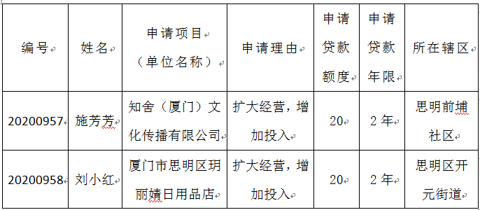 号)文件精神,经基层妇联审核把关,市妇联审核研究,以下人员符合厦门市妇女创业小额担保贷款申请条件,拟同意推荐申请,予以